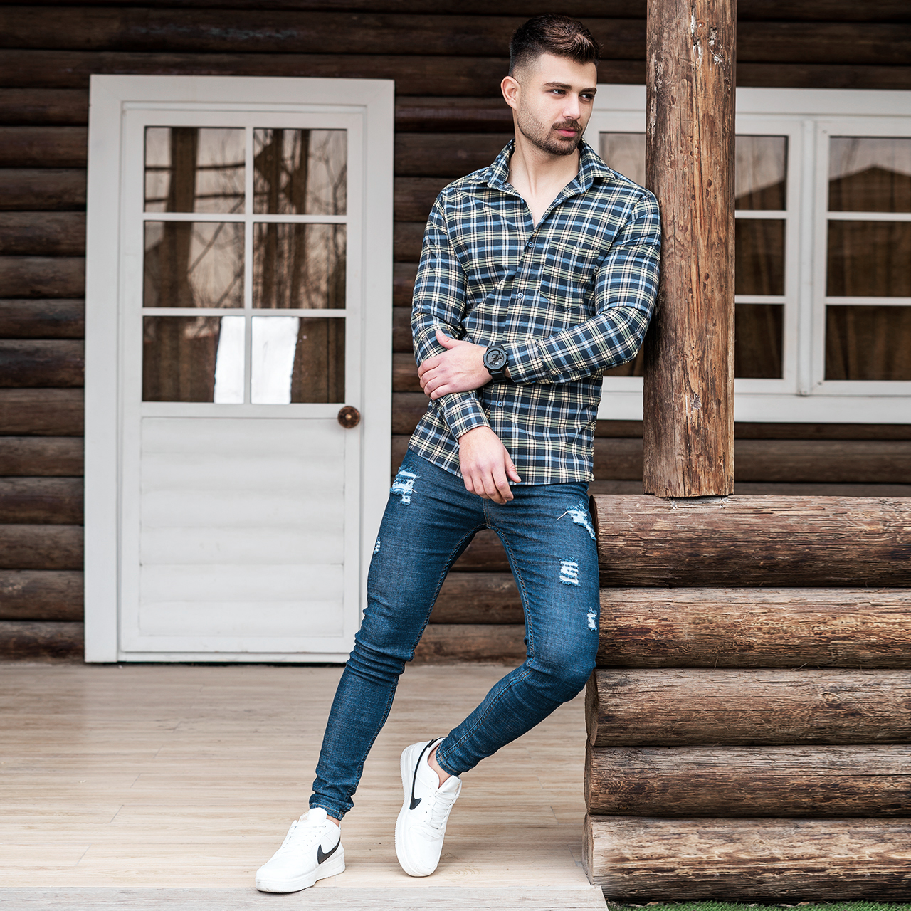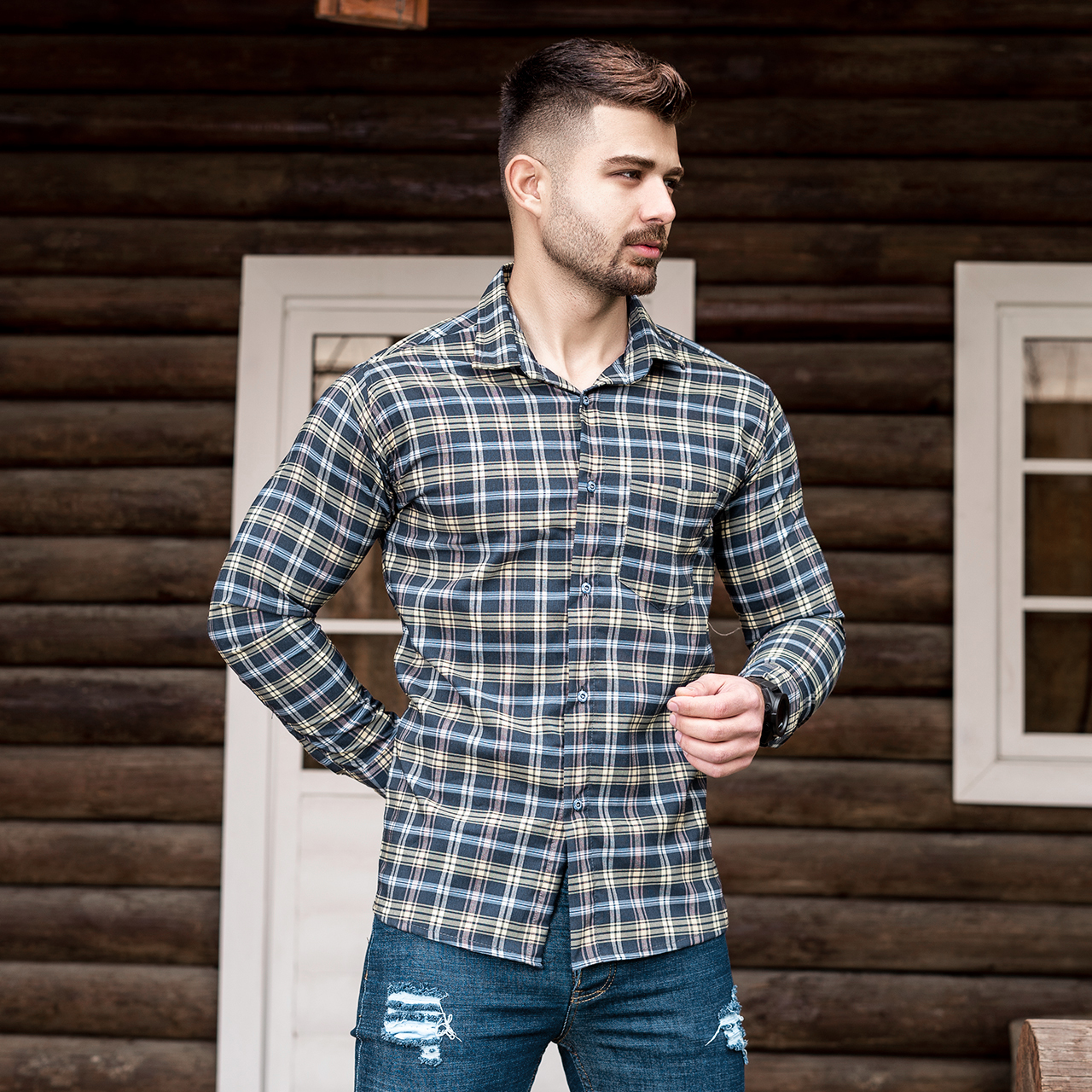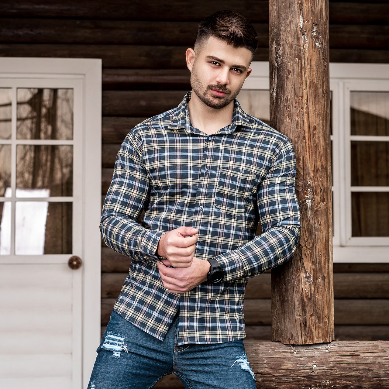 پیراهن چهارخانه کرم سرمه ای مردانه مدلDivan