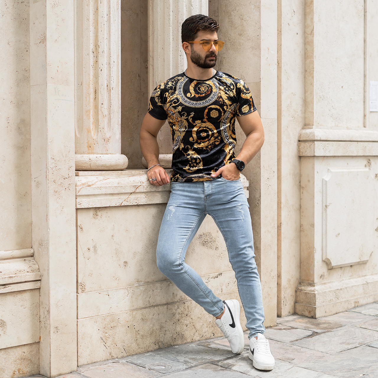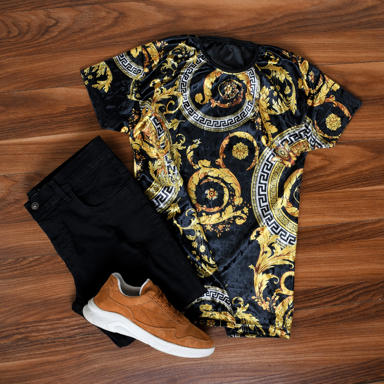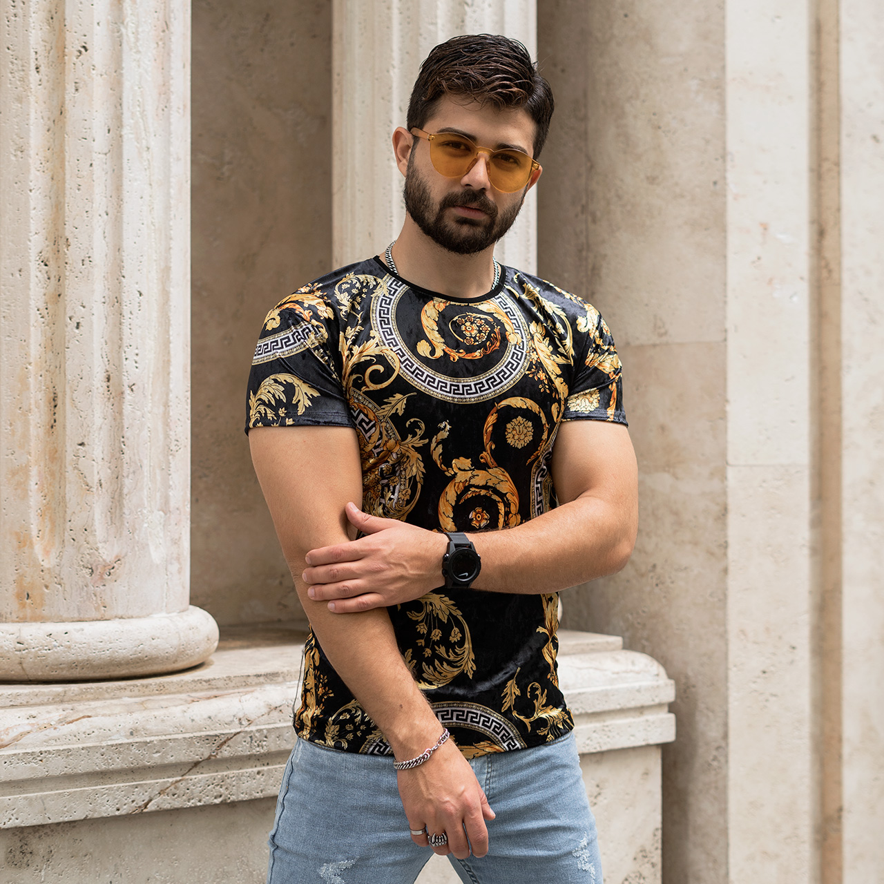 تیشرت مخمل مشکی طلایی ورساچه مردانه مدل 66