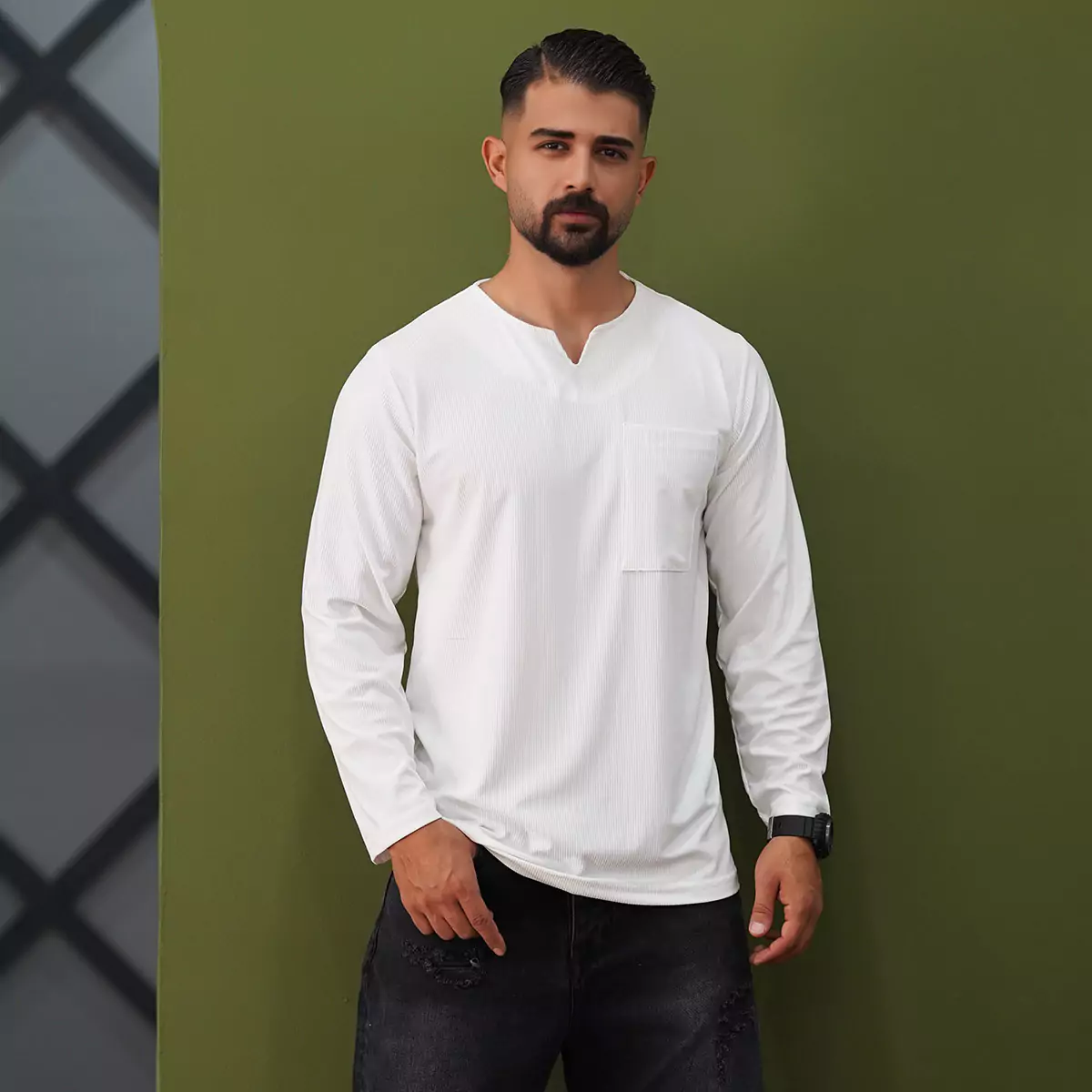 تیشرت آستین بلند یقه کوبایی سفید مردانه مدل Asam