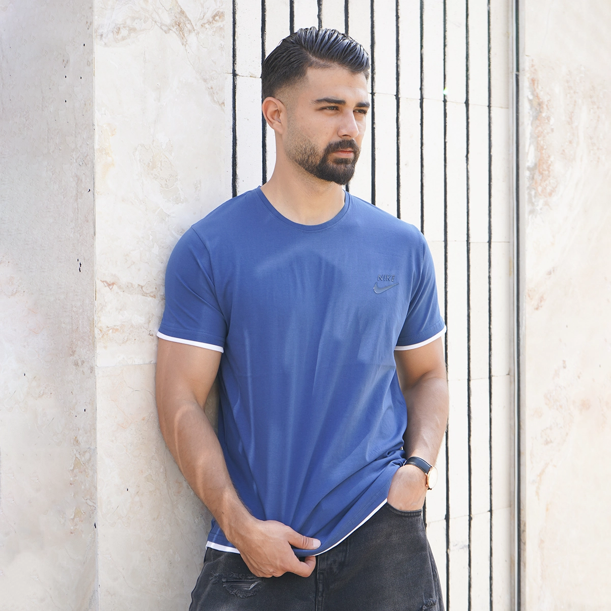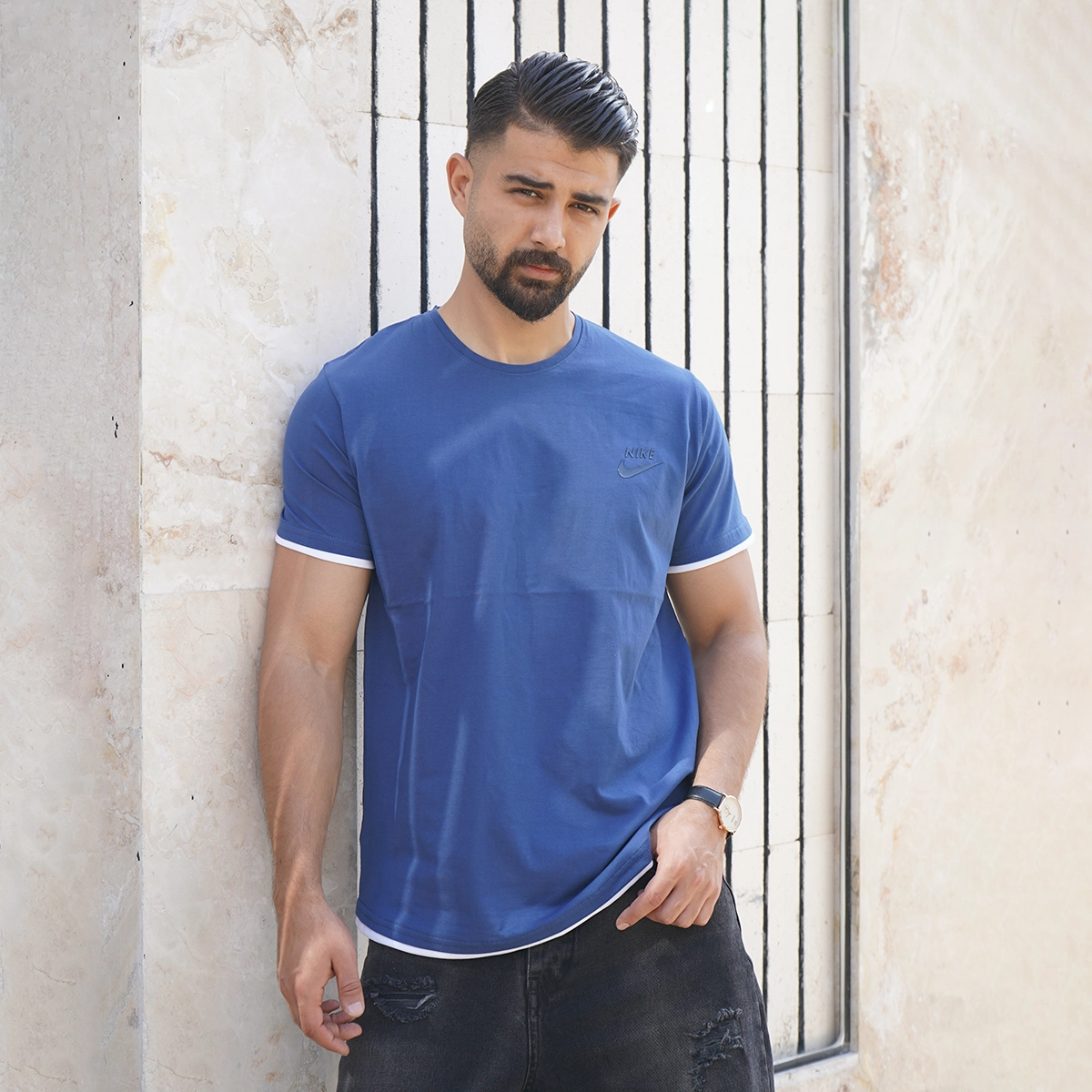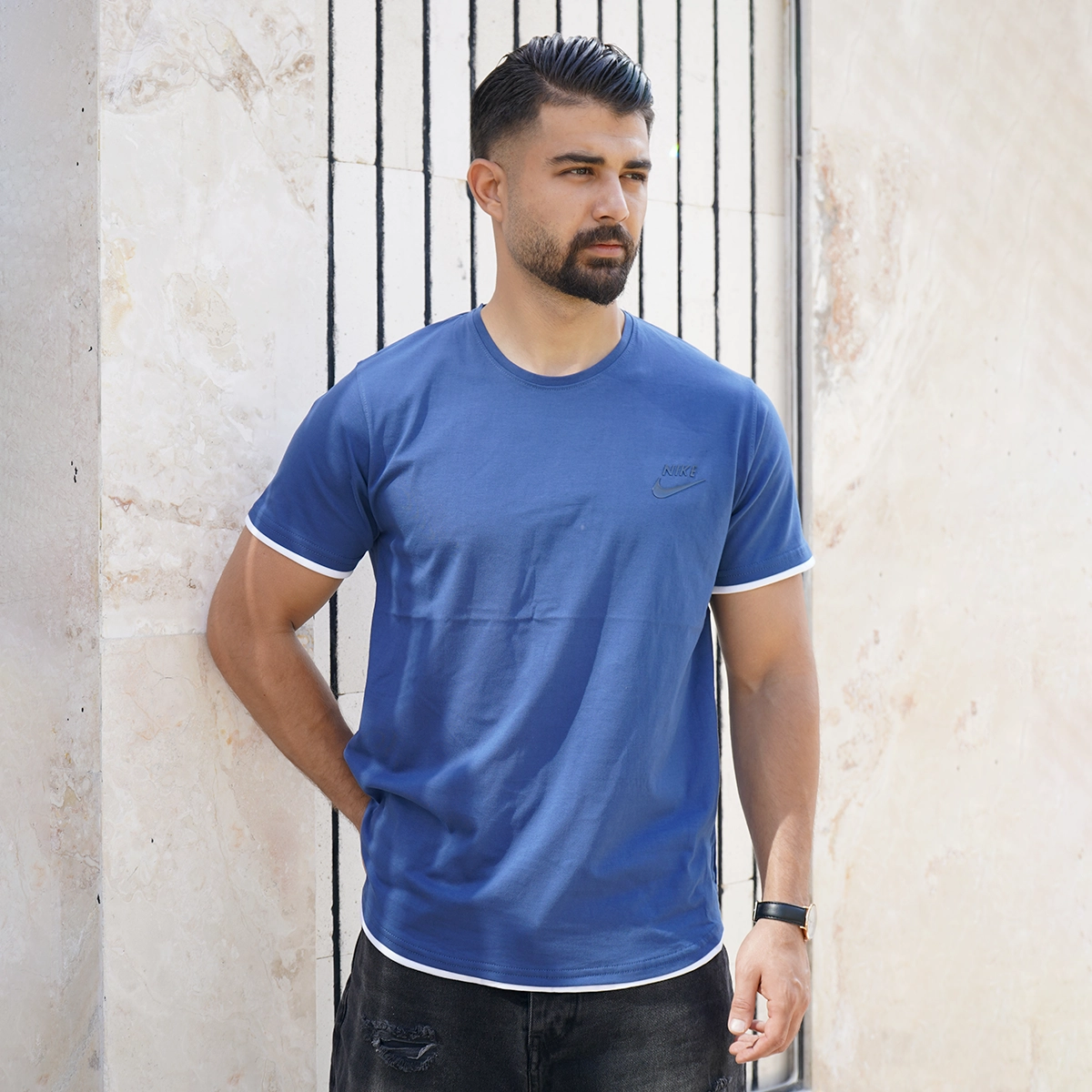 تیشرت یقه گرد آبی مردانه مدل kamyar